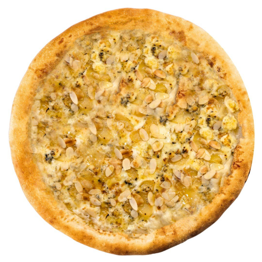 Белый соус, сыр моцарелла, сыр дорблю, груша, миндаль, мед.