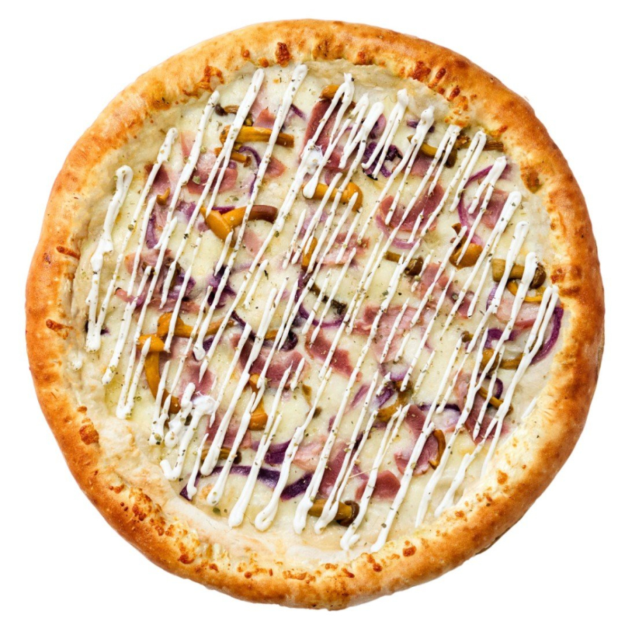 Белый соус, грудинка, сыр моцарелла, опята маринованные, красный лук, грибной соус, смесь итальянских трав.