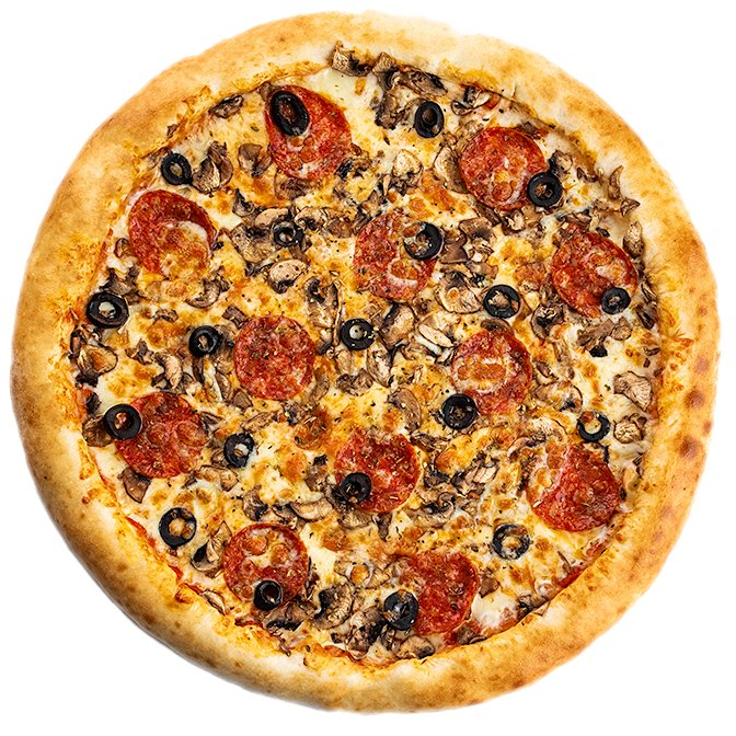Томатный соус, сыр моцарелла, пепперони, шампиньоны, маслины, смесь итальянских трав.