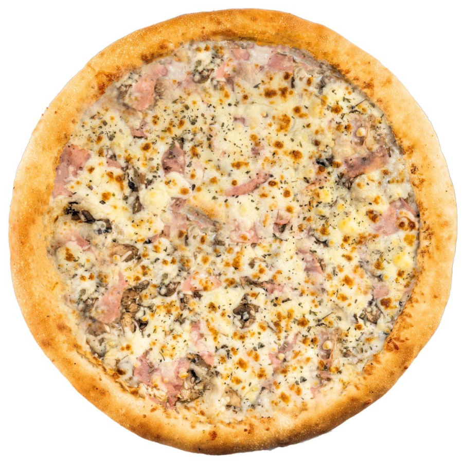 Грибной соус, сыр моцарелла, ветчина, шампиньоны, смесь итальянских трав.