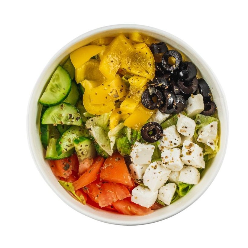 Салат, огурец свежий, томаты, сладкий перец, сыр фета, маслины, масло оливковое, соль, смесь итальянских трав.