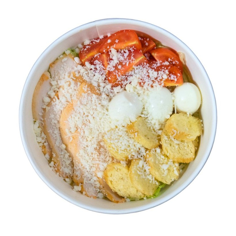 Листья салата, цыпленок запеченный, томаты черри, яйцо перепелиное, сыр пармезан, гренки, соус Цезарь.