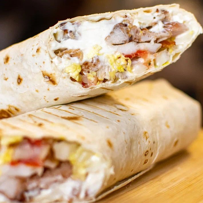 Лаваш, курица, соус чесночный, капуста, огурцы, соус грибной, помидоры, грибы, соус сырный.