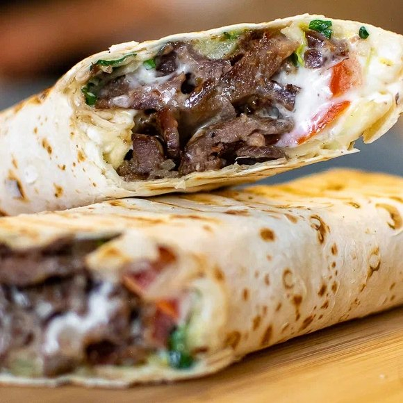 Лаваш, говядина, соус чесночный, капуста, огурцы, зелень, лук маринованный.