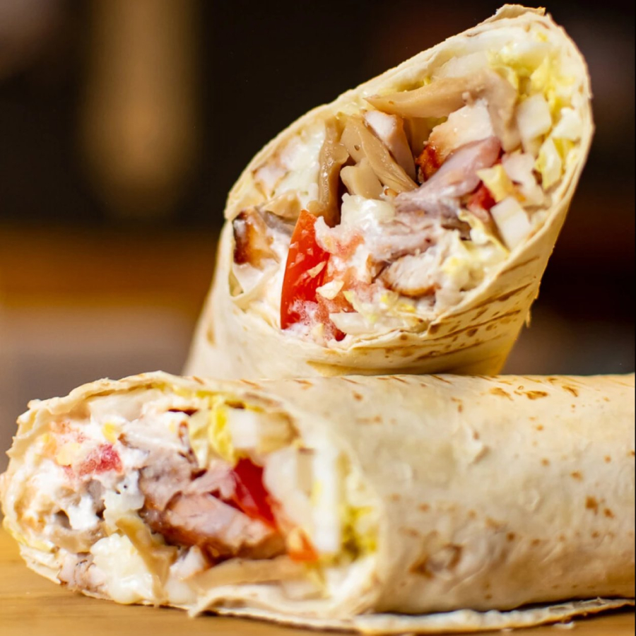 Лаваш, курица, соус чесночный, капуста, огурцы, соус грибной, помидоры, грибы, соус сырный.
