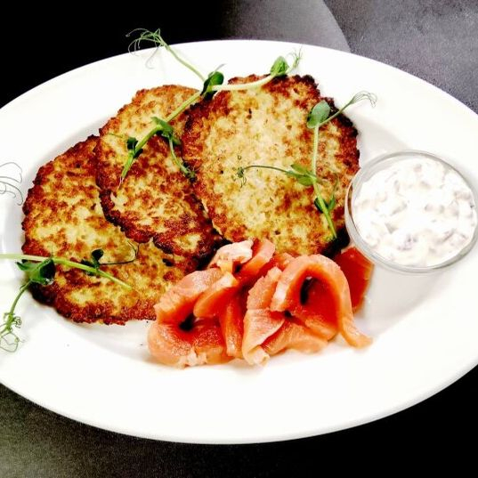 Заказать Драники с сёмгой и соусом тартар, Домашняя Трапеза