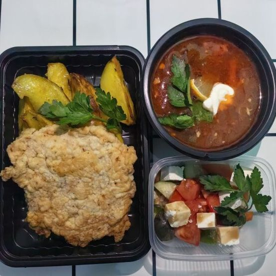 Салат овощной с сыром, солянка, отбивная из свинины, картофельные дольки.