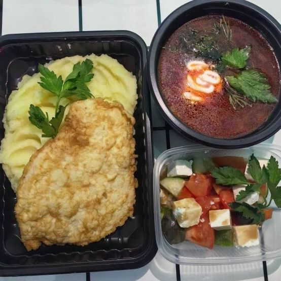 Салат овощной с сыром, борщ, отбивная из птицы, картофельное пюре.