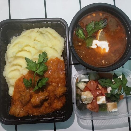 Салат овощной с сыром, солянка, гуляш из свинины, картофельное пюре.