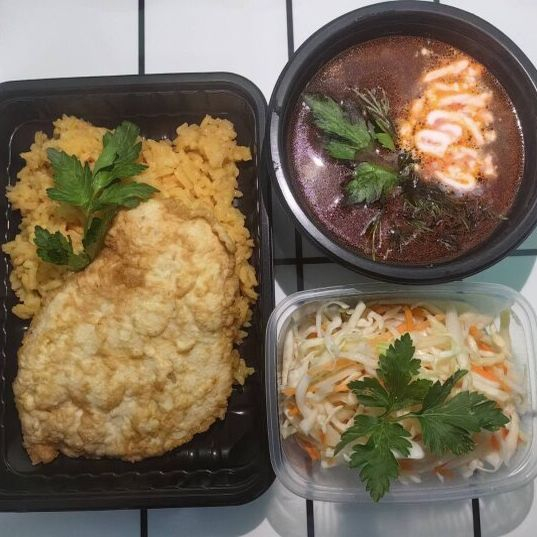 Салат из капусты с морковью, борщ, отбивная из птицы, рис отварной.
