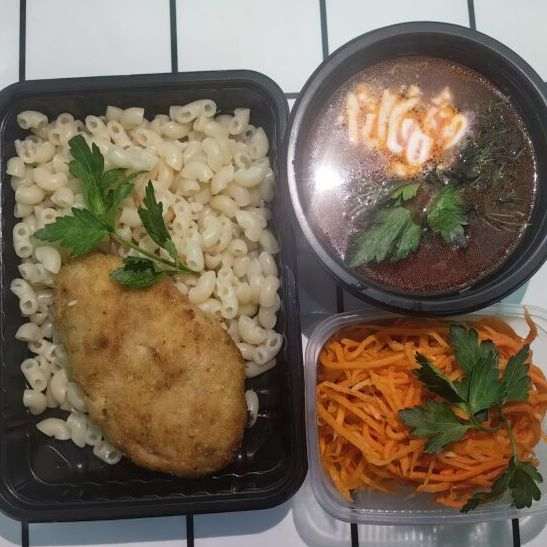 Салат морковь по-корейски, борщ, котлета куриная, макароны отварные.