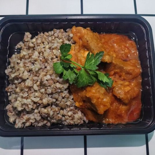 Салат из свеклы с сыром, гуляш из свинины, картофельное пюре.