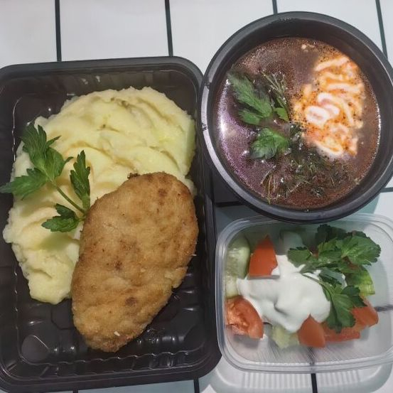 Салат овощной со сметаной, борщ, котлета куриная, картофельное пюре.