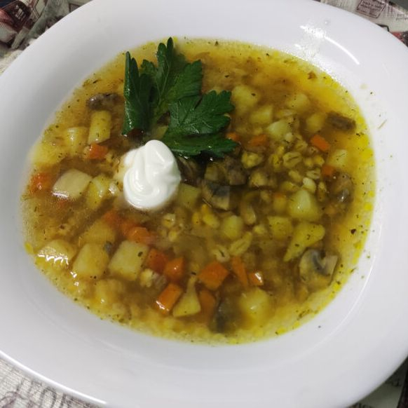 Картофель, перловка, лук, морковь, шампиньоны, зелень, соль, перец, сметана, бульон.