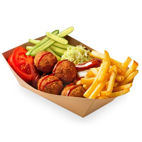 Фалафель, картофель фри, капуста, зелень, фирменный соус, томатный соус, томаты, свежий огурец.