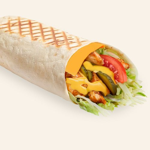 Заказать Лаваш, сочная курица, картофель фри, соленый огурец, томат, фирменный соус, сырный соус, зелень, специи.