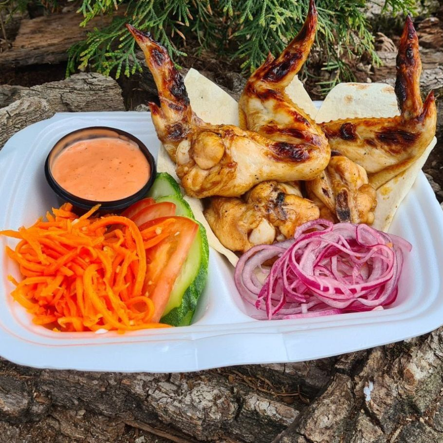 Крылышки, лаваш, соус шашлычный, огурец, помидор, морковь по-корейски, лук маринованный.