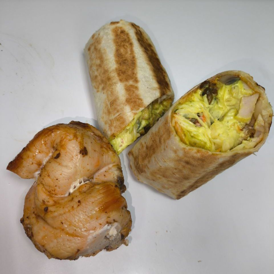 Лаваш, шашлык куриный, капуста свежая, корейская морковь, свежие помидоры, свежие или маринованные огурцы, жареные грибочки, соус чесночный фирменный, грибной соус.