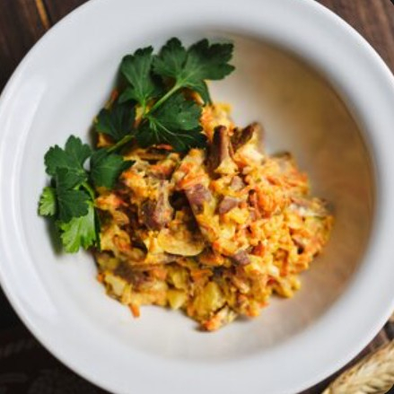 Сытный салат с обжаренными морковью, луком и сердечками, отварным яйцом и картофелем с маринованным огурцом, заправляется майонезом.