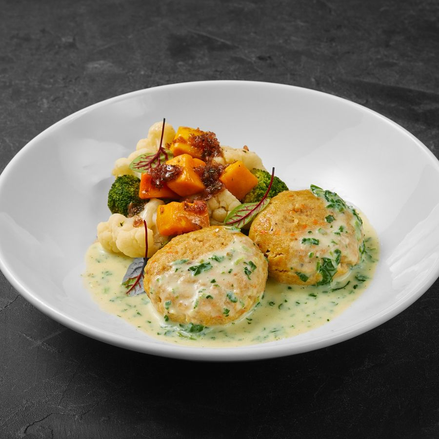 Паровые рыбные биточки в сливочном соусе со шпинатом и гарниром из отварной капусты брокколи и цветной с печеной тыквой.