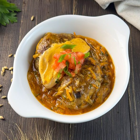 Приготовленные по домашнему рецепту ленивые голубцы из капусты со свининой и говядиной, запеченные в сметанно-томатном соусе.