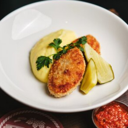 Котлеты из говядины, куриного филе и свинины, с картофельным пюре, аджикой и маринованным огурчиком.