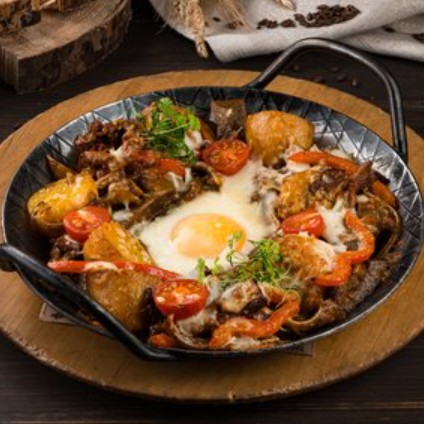 Угощение из деликатесного телячьего языка с копчеными свиными ушами в соусе, вместе с жареным картофелем с лесными грибами и яичницей.