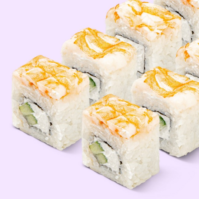 Рис, мицукан, сахар, комбу, соль, нори, креветка, сыр сливочный, огурец.