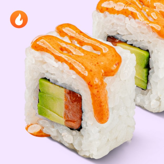 Лосось, авокадо, соус спайс, рис, нори.