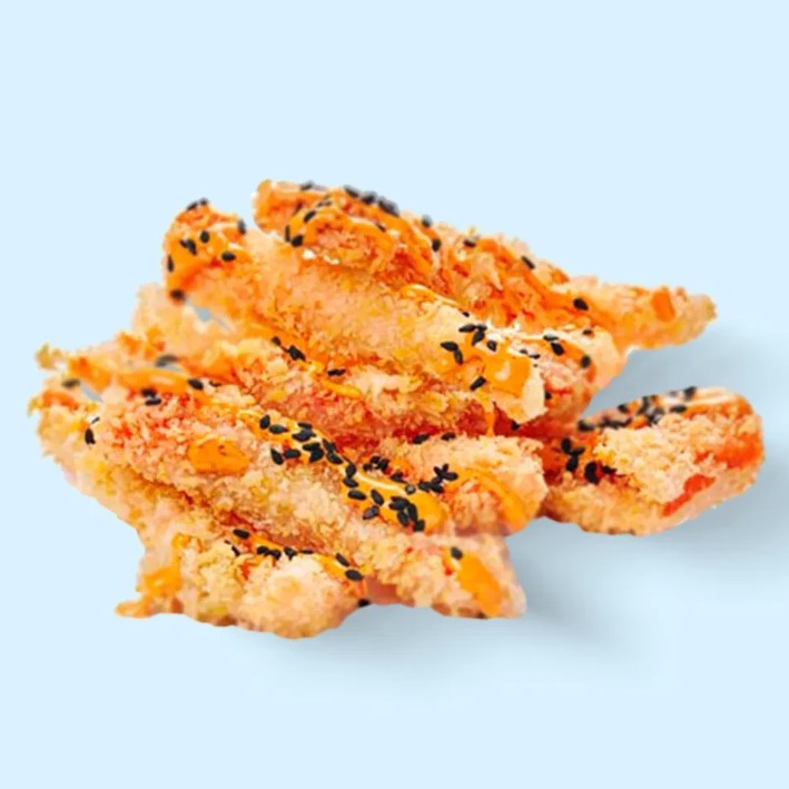 Креветка, яичный порошок, мука, соль, сухари панировочные, паста кимчи, майонез.