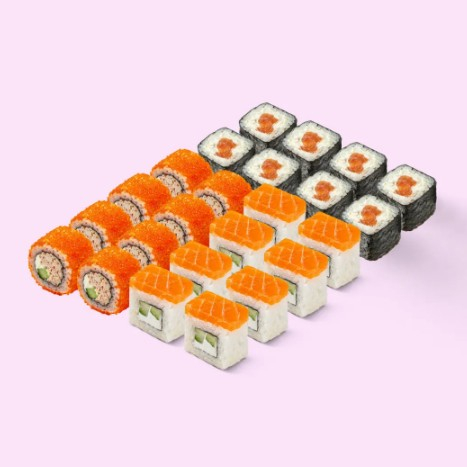 Ролл филадельфия Лайт, Калифорния с крабом, Чиз маки лосось. Японский гарнир не входит в стоимость!