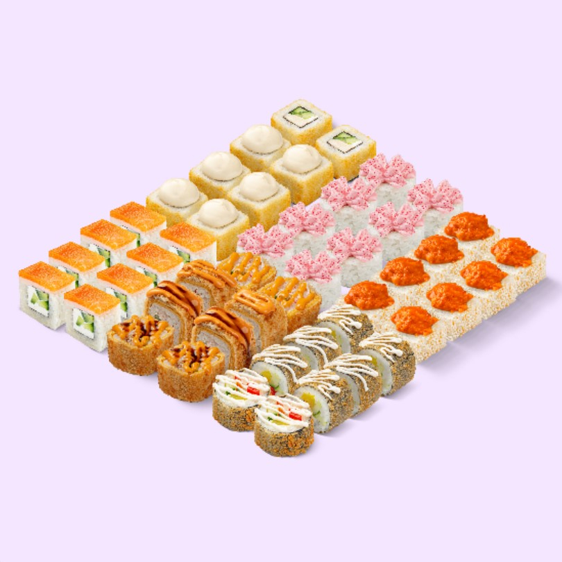 Филадельфия с огурцом, Цезарь, Эби темпура, Калифорния, Лава сяке, Запечённый с курицей, Яссай Спайс.
