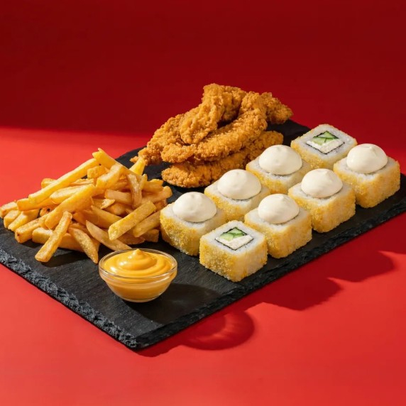 Серьёзный сет для серьёзного аппетита! Состав: Картофель фри, Стрипсы куриные, Цезарь темпура, Сырный соус.