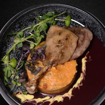 Утиная ножка с пюре из батата, с базиликом и вишневым демигласом