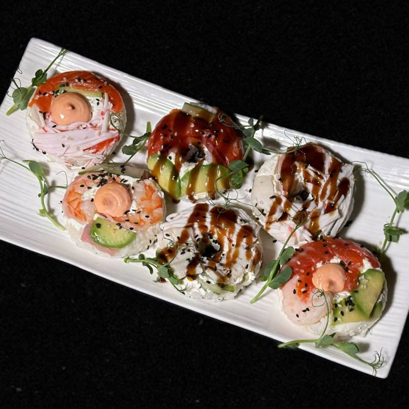Рис, сахар, уксус рисовый, крем-чиз, креветка, огурец, лосось, тунец, кальмар, крабовые палочки, авокадо, нори.