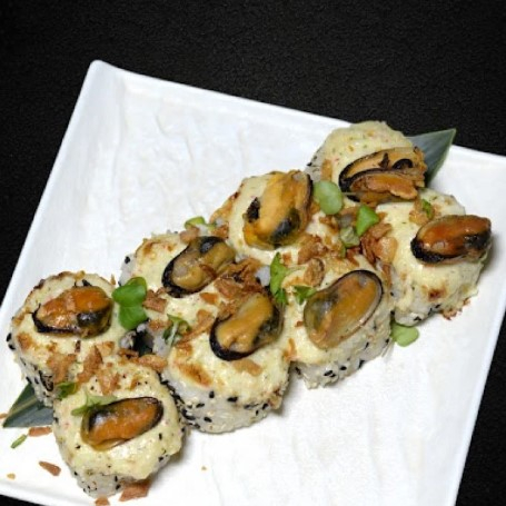 Заказать Рис, нори, сыр творожный, лук порей, свежий огурец, мидии, соус чесночный, лук фри.