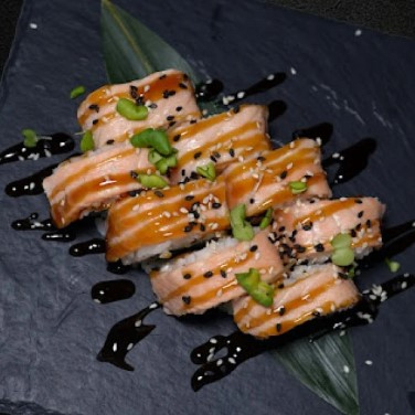 Заказать Рис, нори, творожный сыр, огурец, лосось, кунжут, унаги соус.