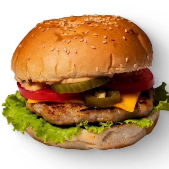 Заказать Булочка для бургера, лист салата, соус бургер, томат, маринованный огурец, сыр чеддер, куриная или свиная котлета на выбор.