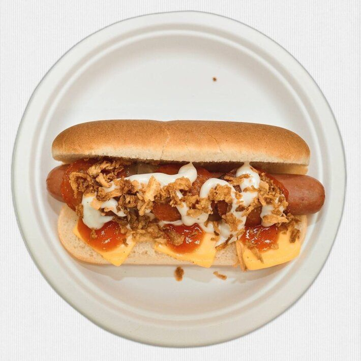 Булочка для хот-дога, сосиска, бекон, карамелизованный лук, горчица, огурец, кетчуп, сыр Чеддер.