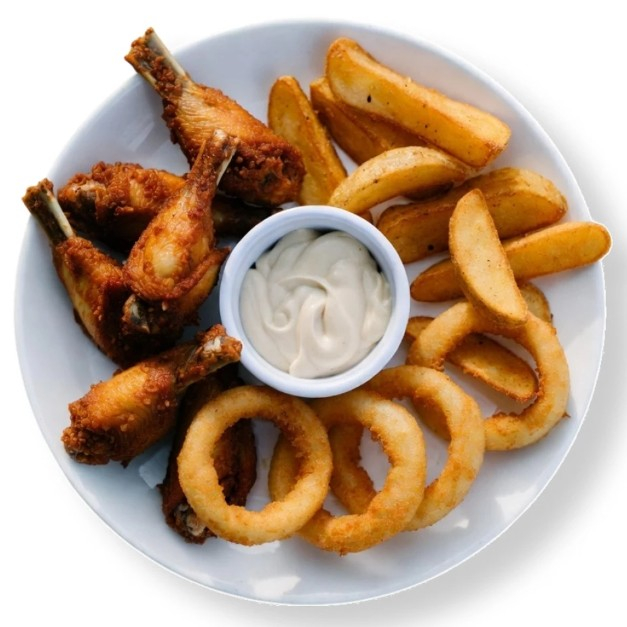 2 молочных коктейля, большой картофель фри, большие наггетсы, большие луковые колечки, большие сырные палочки, 2 соуса на выбор.