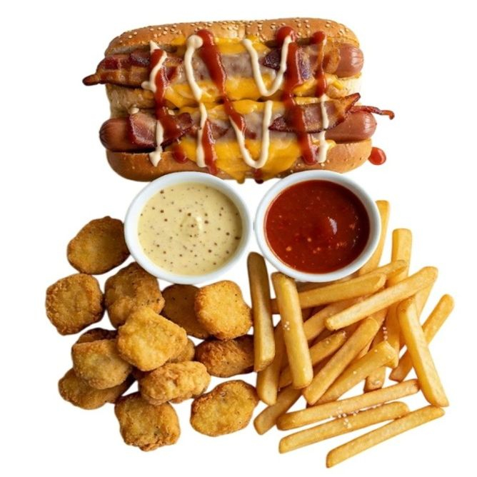2 хот-дога на выбор: чоризо, беконио, халапперони большой картофель фри, большие наггетсы, 2 соуса на выбор.