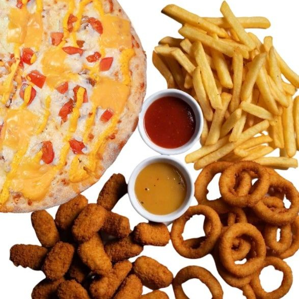 Пицца на выбор: мясная, бургер-пицца, четыре сыра, сырный чикен, чикен ранч большие наггетсы, большой картофель фри, большие луковые колечки, 2 соуса на выбор.