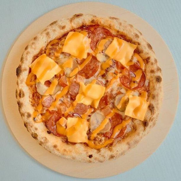 Пицца соус, сыр моцарелла, колбаски Баварские, колбаски Пепперони, томаты, лук, сухой чеснок, маринованный огурец, соус Бургер, сыр Чеддер.