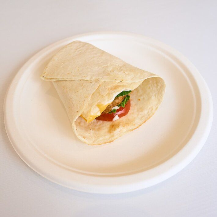 Заказать Тортилья, свежий лист салата, свежий огурец, томаты, сухой чеснок, сыр Чеддер, куриная котлета, соус Цезарь.