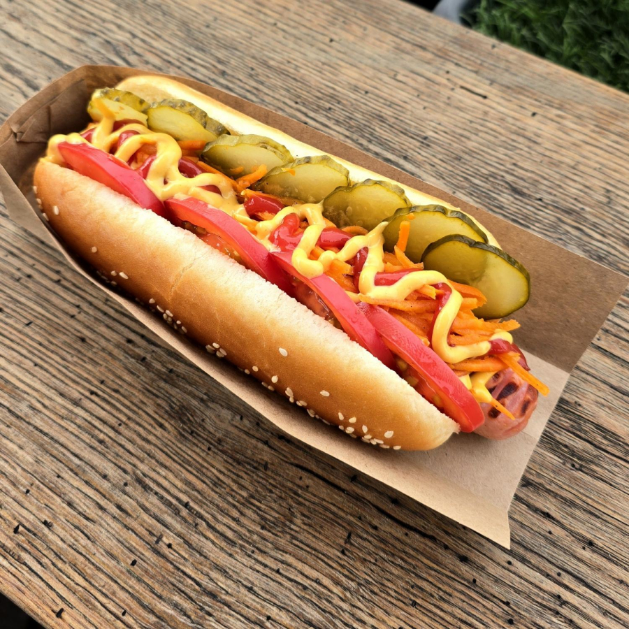 Булочка, сосиска свинина/говядина, свежий помидор, солёный огурец, морковь по корейски, кетчуп, горчичный соус.