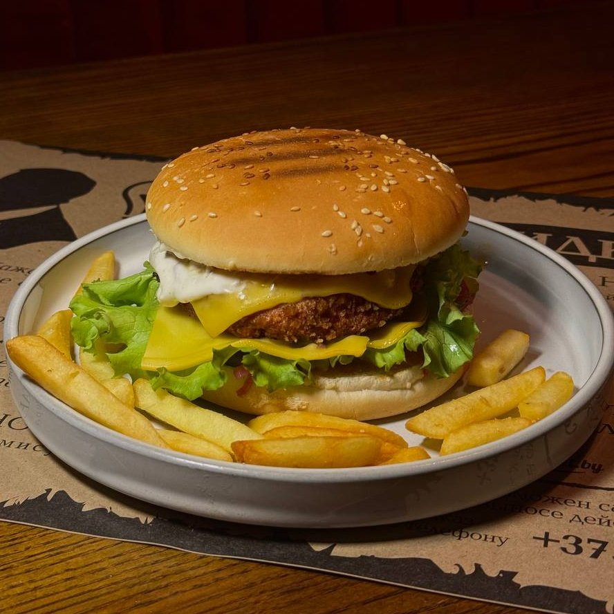 Заказать Булочка, котлета говяжья, халапеньо, огурец соленый, луковые кольца, соус Бургер, сладкий чили, сыр Чеддер, салат, картофель фри.