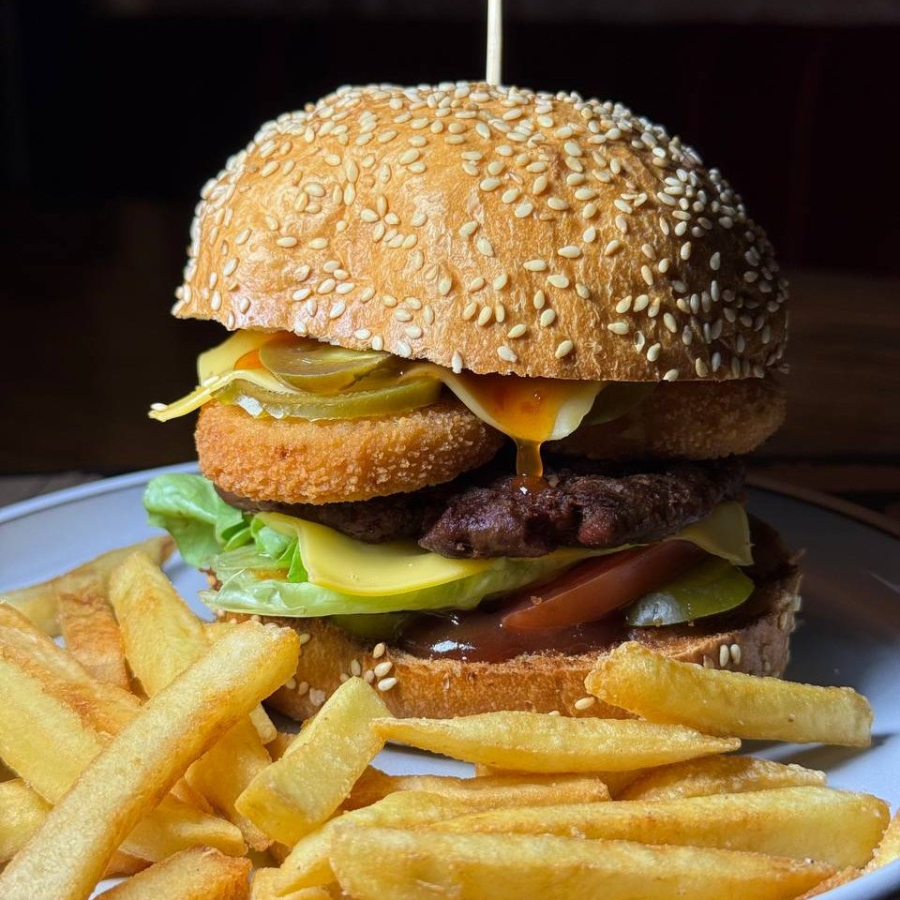Булочка, котлета говяжья, халапеньо, огурец соленый, луковые кольца, соус Бургер, сладкий чили, сыр Чеддер, салат, картофель фри.