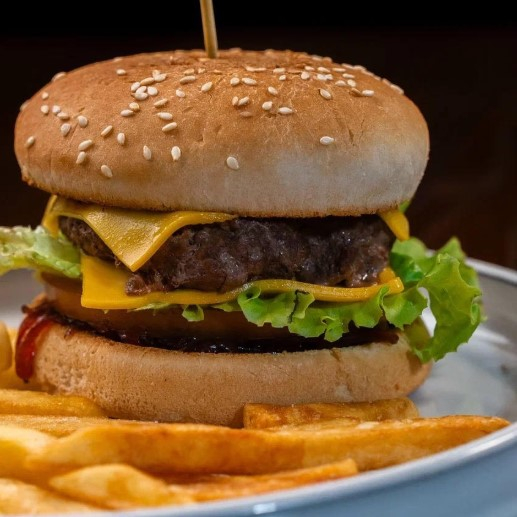 Булочка, сыр Чеддер, салат, томат, огурец соленый, котлета говяжья, соус сырный, картофель фри, дор блю.