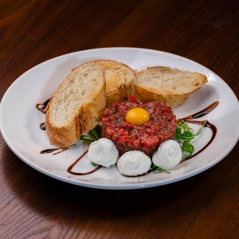 Заказать Говядина, каперсы, лук красный, корнишоны, заправка, гренки, желток перепелиный.