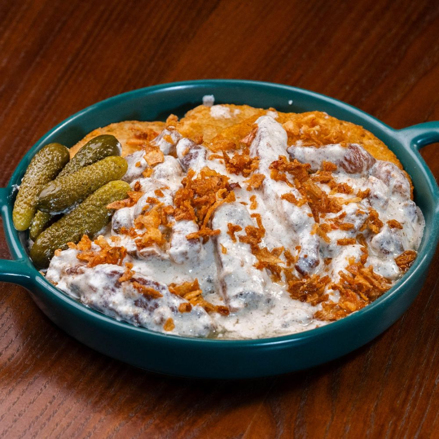 Драники, шампиньоны, свинина, корнишоны, лук красный, сливки, чесночное масло, зелень.